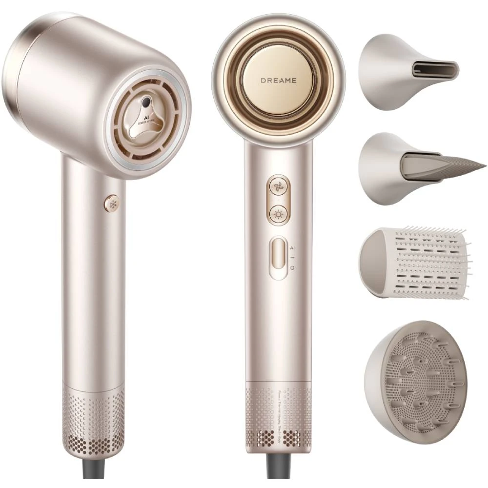 Фен Dreame Gusto Pink Gold поставляется с широким набором аксессуаров, которые делают процесс укладки еще более удобным и разнообразным. В комплект входят концентратор для точной сушки, диффузор для создания объема и текстуры, овальная щетка для укладки и насадка-гребень с широкими зубцами для бережного расчесывания волос. Все насадки легко сменяются, что позволяет быстро переходить от одной укладки к другой.