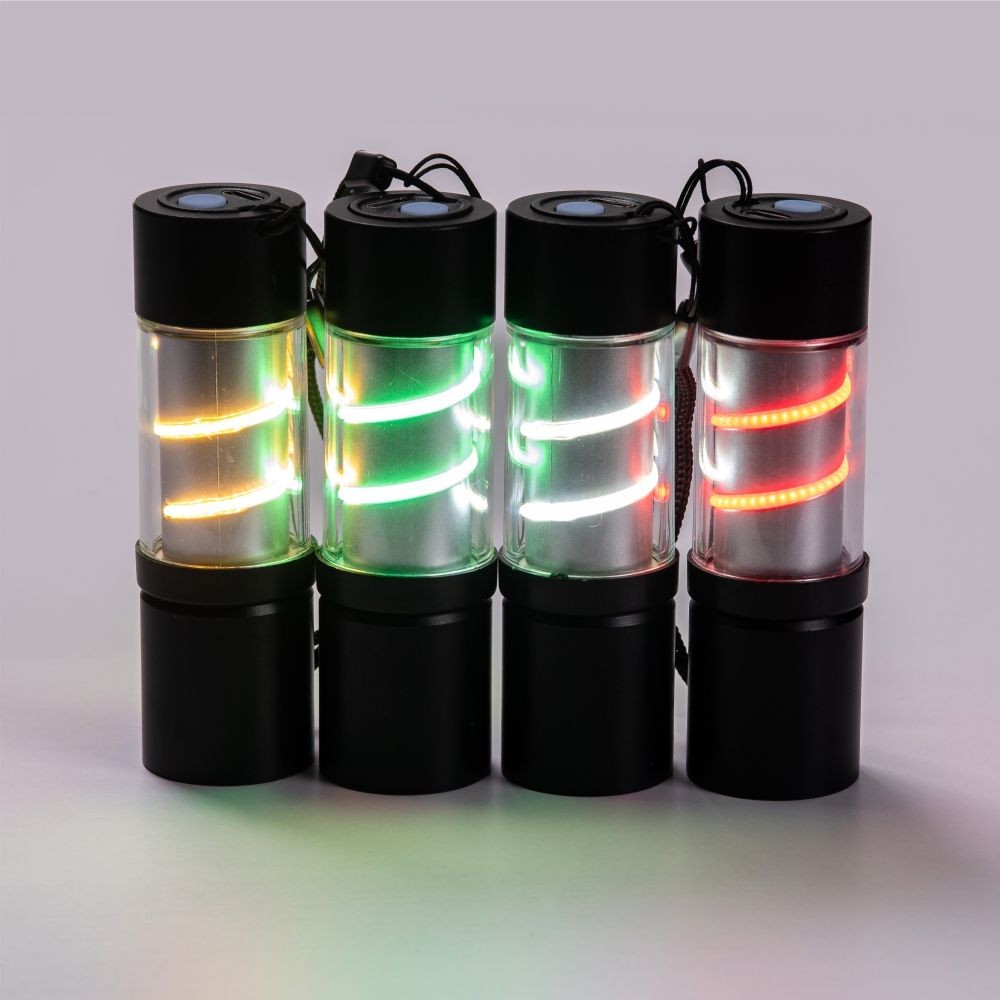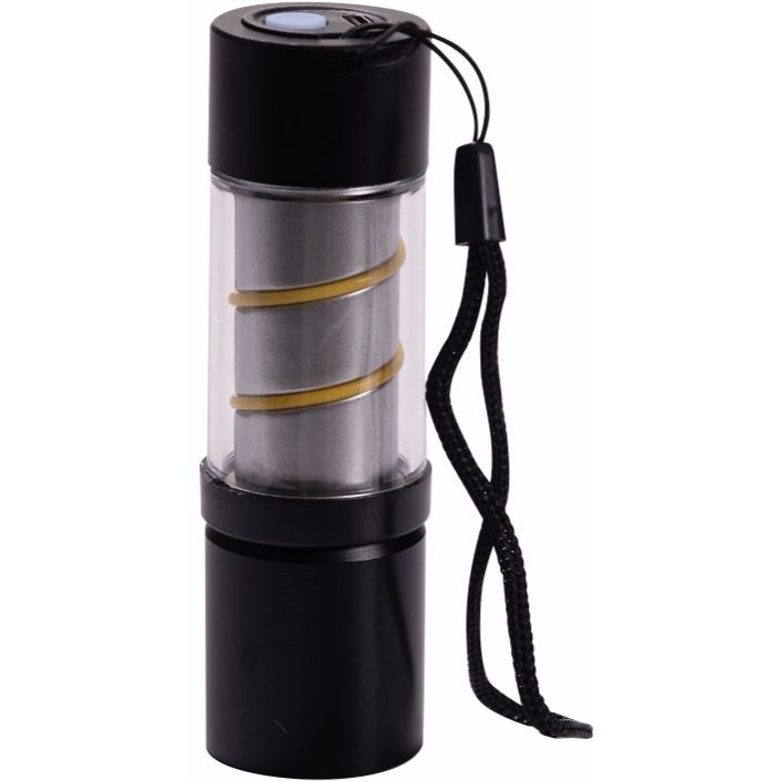 оснащен XPE LED лампой с подсветкой белого света и ремешком; на наружном светильнике вольфрамовая нить для мягкого, тёплого освещения