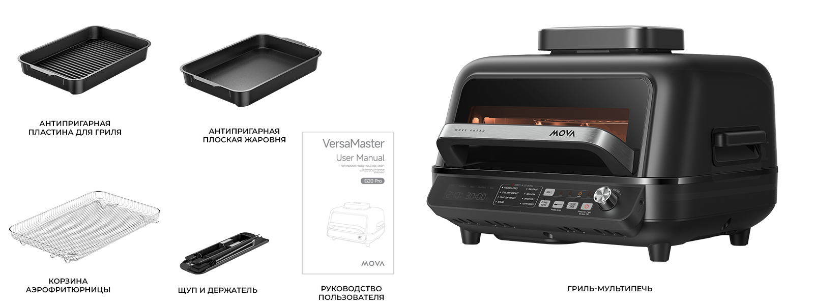 Готовьте легко и с комфортом вместе с мультифункциональным грилем MOVA IG20 PRO, поддерживающим множество аксессуаров в комплекте.