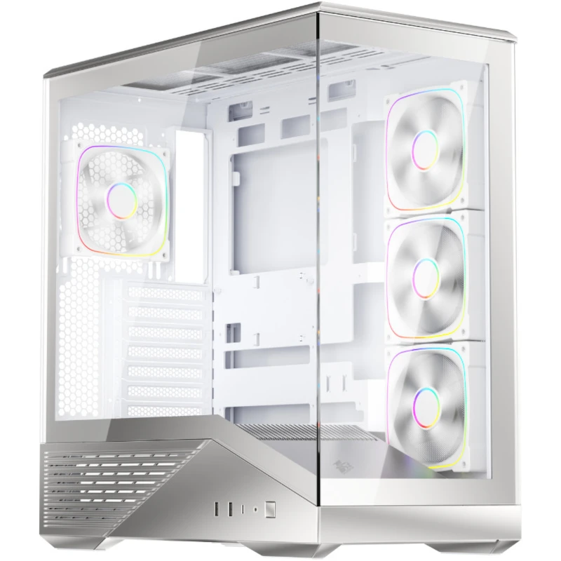 Корпус 1STPLAYER GM7 Silver оснащен множеством посадочных мест для вентиляторов, включая заднее, верхнее, боковое и нижнее расположение, что позволяет эффективно управлять температурным режимом внутри корпуса. Поддержка вентиляторов размером 120 мм и 140 мм обеспечивает дополнительные возможности для индивидуальной настройки системы охлаждения.