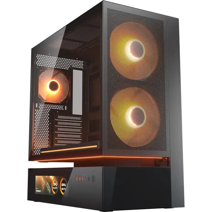 Особенности корпуса включают возможность установки систем водяного охлаждения (СВО) и систему организации кабелей, что обеспечивает аккуратный и упорядоченный вид внутри корпуса. Подсветка и дисплей добавляют уникальности и позволяют выразить индивидуальность вашего ПК.