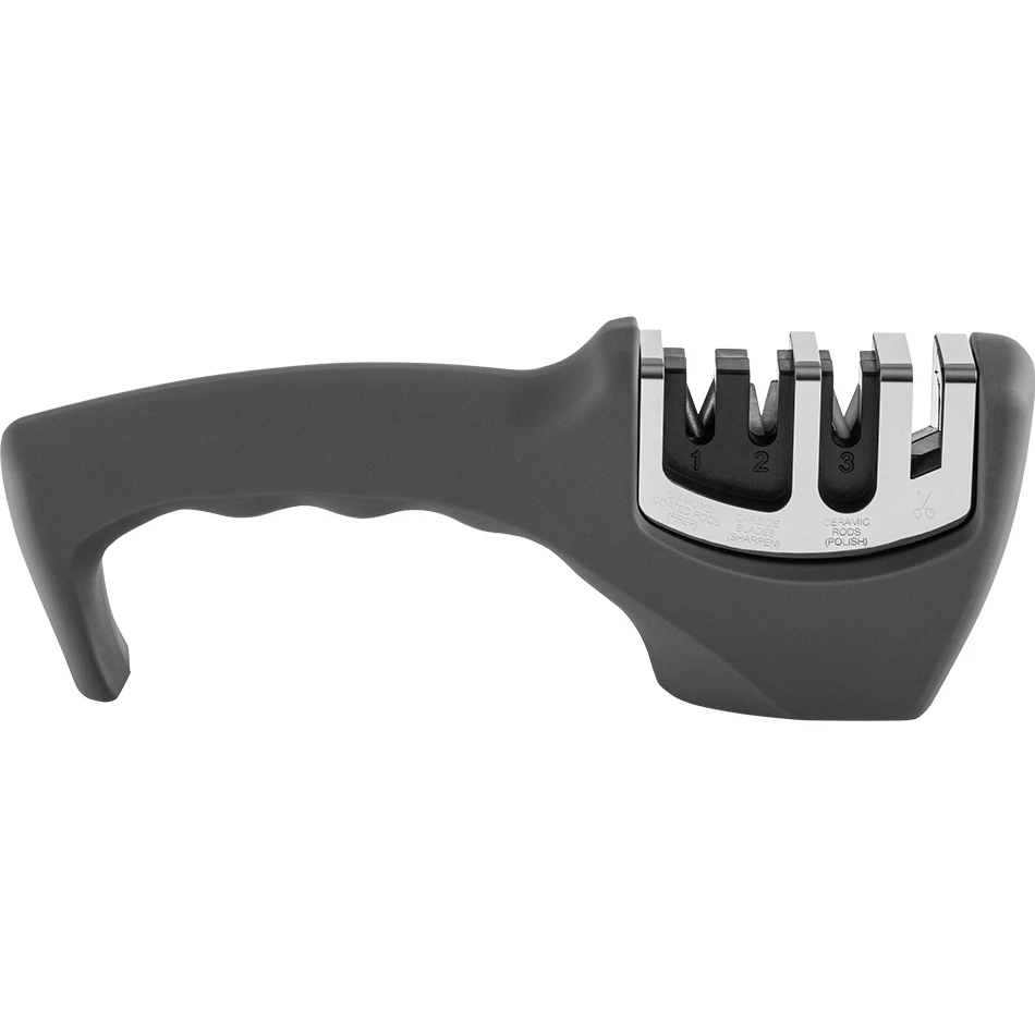 Рукоятка точилки изготовлена из прочного пластика, обеспечивая комфортный и надежный захват во время использования. Эргономичный дизайн позволяет удобно держать точилку в руках, минимизируя усилия и повышая безопасность при заточке. Компактные размеры делают точилку VINZER 4 в 1 удобной для хранения, экономя место на вашей кухне.