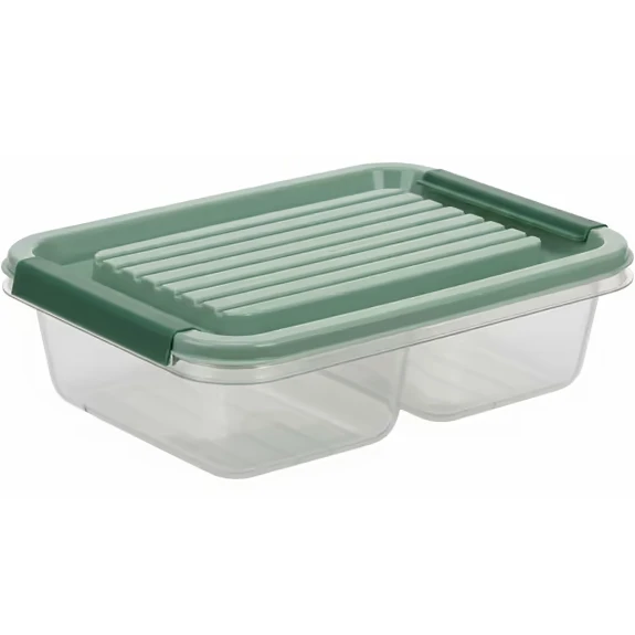 Особенность контейнера заключается в его двухсекционной конструкции, которая позволяет удобно разделять продукты. Это особенно полезно для тех, кто ценит порядок и практичность. Объем контейнера составляет 0.5 литра, что делает его идеальным для хранения небольших порций еды, закусок или ингредиентов.