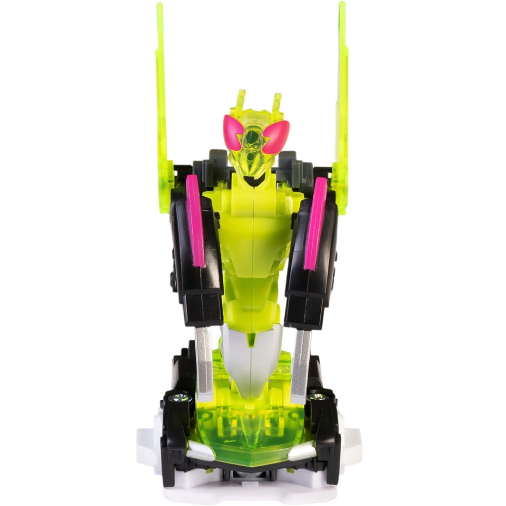 Набор включает в себя машинку-трансформер, которая выполнена из высококачественного пластика, обеспечивающего долговечность и надежность в использовании. Запускатель-бластер позволяет легко и быстро активировать трансформацию, что добавляет элемент неожиданности и азарта в игровой процесс. В комплект также входят три диска, которые служат для запуска механизма трансформации, а также лист с наклейками, позволяющий детям персонализировать их игрушку по своему вкусу.