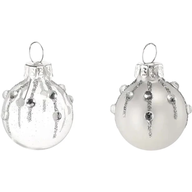 12 украшений двух типов: 6 прозрачных шариков, украшенных серебристыми блестками и декоративными каплями, и 6 матовых серебристых с выразительными объемными деталями
