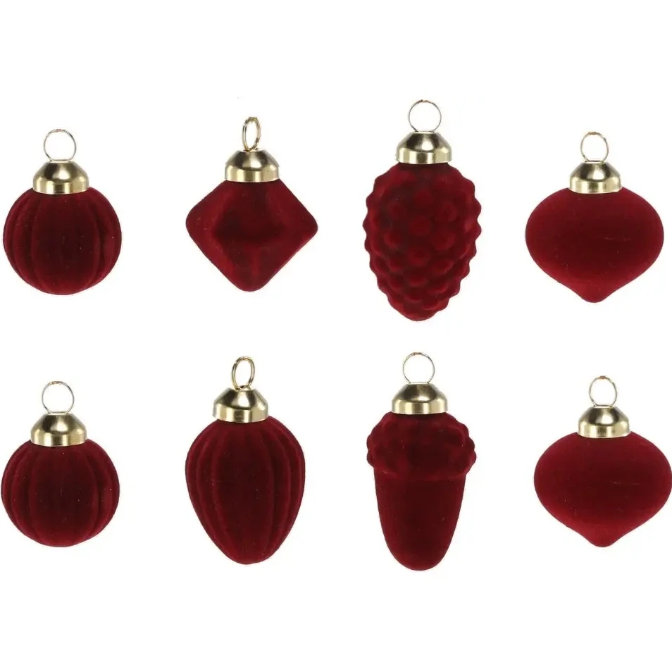 Материал, из которого изготовлены игрушки, — это стекло, что придает им особую изысканность и блеск. Стеклянные игрушки всегда были символом утонченности и роскоши, и этот набор не является исключением. Велюровое покрытие добавляет текстурности и глубины, создавая эффект мягкости и тепла в вашем интерьере.