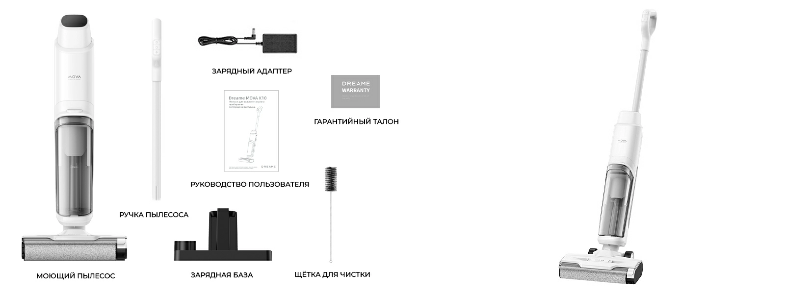 Зарядная база, Щетка для чистки, Зарядный адаптер, Руководство пользователя, Гарантия