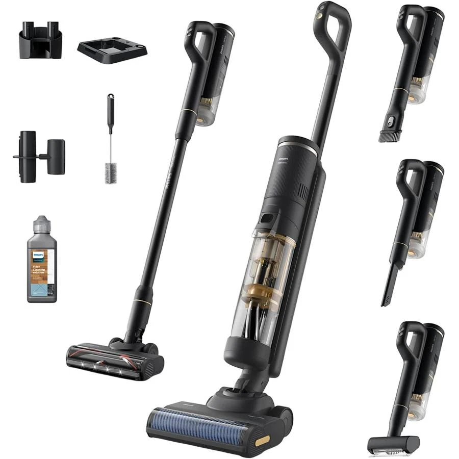 Пылесос, Станция для хранения устройства после очистки, Длинная щелевая насадка, Комбинированная насадка 2-в-1, Щетка для очистки, Моторизованная минитурбощетка, Моющее средство