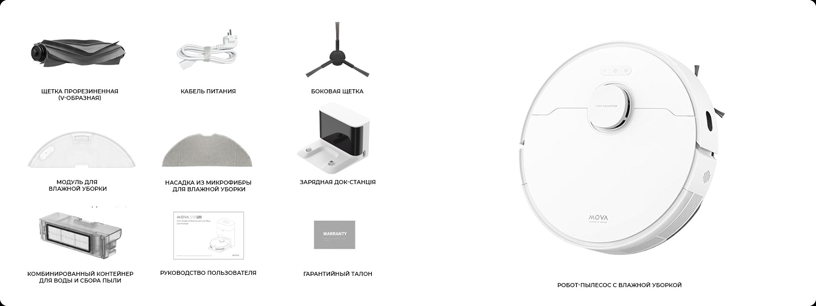 Зарядная станция, боковая щетка, швабра, инструкция, гарантийный талон
