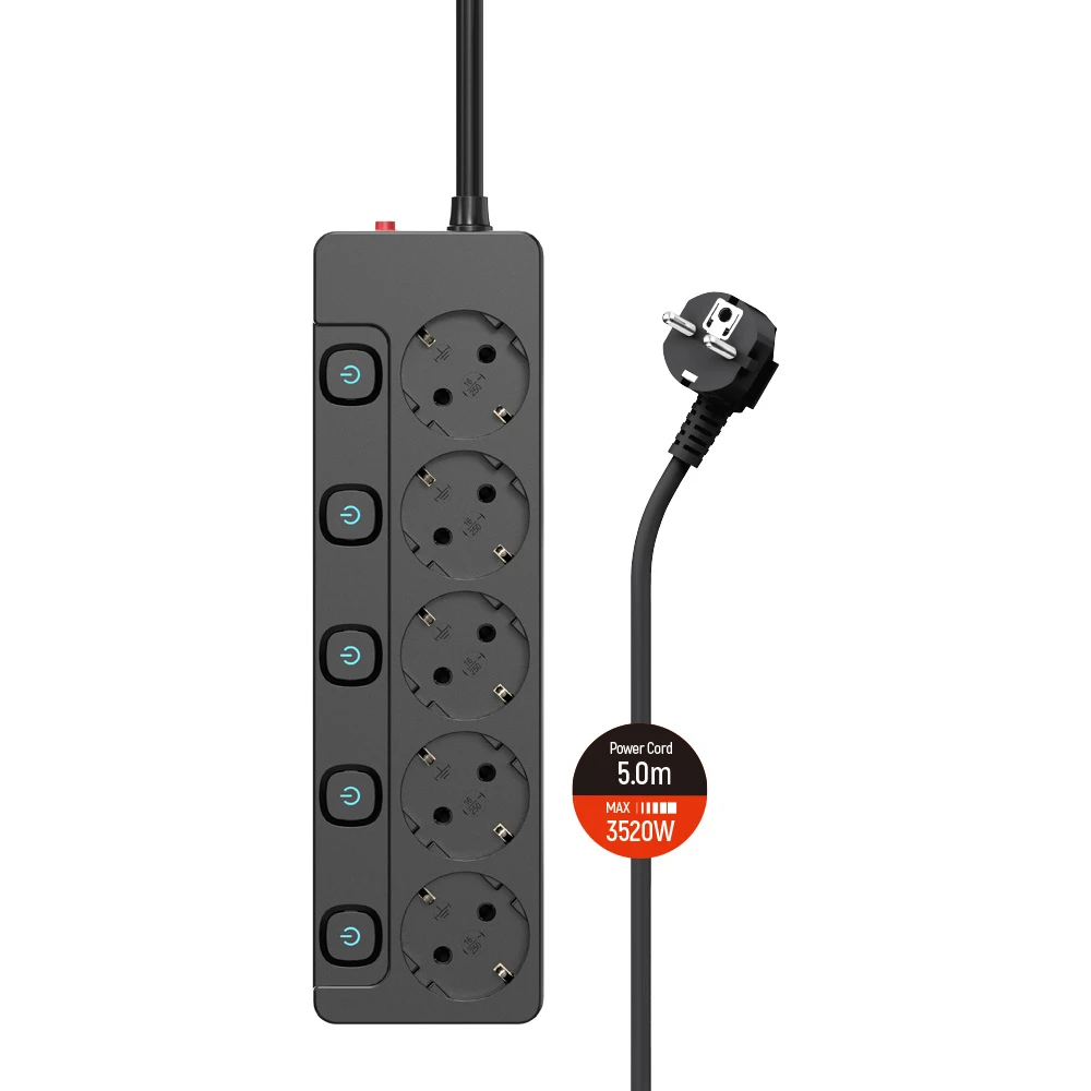 Сетевой фильтр Colorway CW-PSEA55SBK оснащен пятью евророзетками с заземлением (Тип F), что гарантирует надежное подключение и защиту от статического электричества. Каждая розетка оснащена индивидуальным выключателем, что позволяет экономить электроэнергию и повышает удобство использования. Длина кабеля составляет 5 метров, что обеспечивает гибкость при размещении устройства в помещении, а сечение кабеля 1,5 мм² и три жилы гарантируют долговечность и надежность.