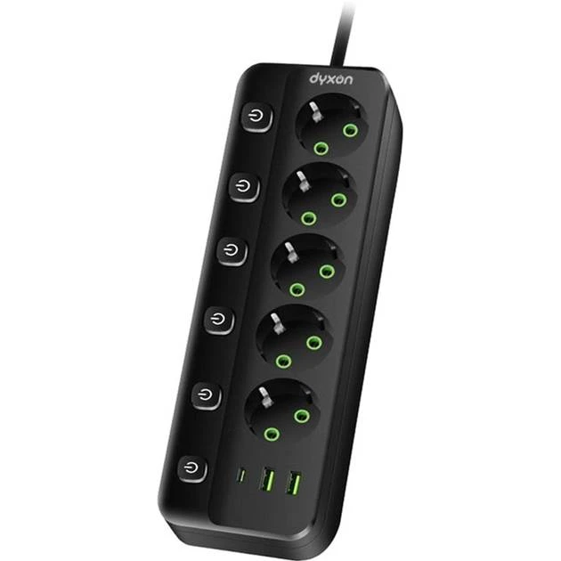 DYXON PRO-1098 оснащен пятью еврозетками с заземлением (Тип F), что позволяет подключать различные устройства одновременно. Каждая розетка имеет свой выключатель, что позволяет индивидуально управлять питанием подключенных приборов. Это особенно удобно в ситуациях, когда необходимо отключить одно устройство, не затрагивая другие.