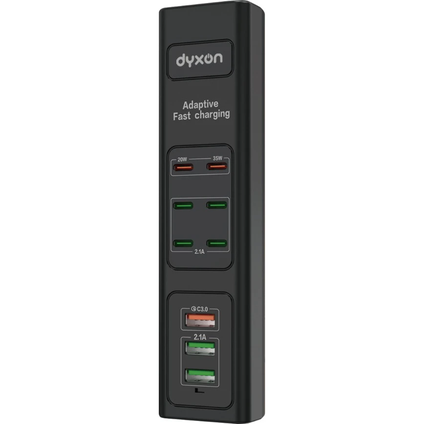 DYXON US-D01 оснащен 9 USB-выходами, из которых 6 — USB-C и 3 — USB-A. Такая конфигурация позволяет подключать широкий спектр устройств, от смартфонов и планшетов до ноутбуков и других гаджетов. Это делает его незаменимым помощником как дома, так и в офисе. Дополнительные 4 порта USB-C обеспечивают возможность быстрой зарядки современных устройств, что особенно актуально в условиях постоянной нехватки времени.