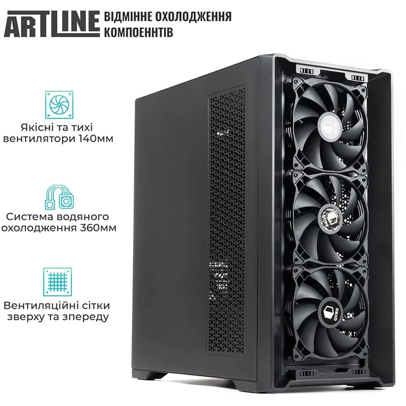 Компьютер ARTLINE WorkStation W96 разработан с учетом требований к охлаждению и надежности. В корпусе QUBE ARGON WS установлены 3 вентилятора по 140 мм спереди, 1 вентилятор по 140 мм сзади и 3 вентилятора по 120 мм сверху для системы охлаждения. Процессор охлаждается с помощью 360 мм WaterCooler Black, что обеспечивает стабильную работу системы даже при максимальных нагрузках.