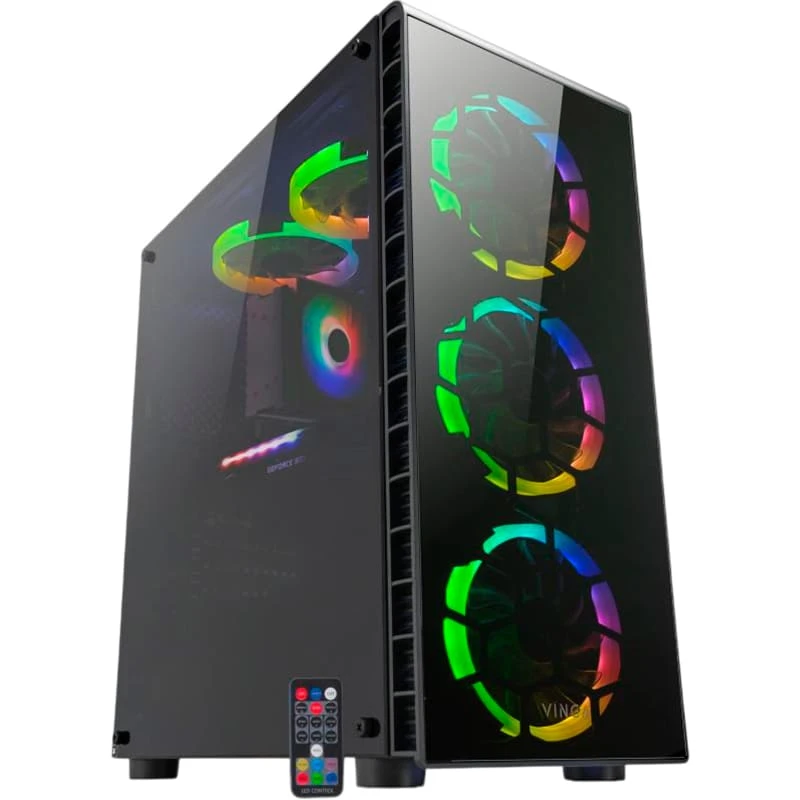 Система охлаждения включает пять 120 мм RGB LED вентиляторов и башенный кулер RGB для процессора, что обеспечивает стабильную работу даже при максимальных нагрузках. Корпус Vinga Orc не только защищает внутренние компоненты, но и придает устройству стильный и современный вид. Компьютер имеет габариты 19.2 x 43.5 x 37.5 см, что делает его компактным и удобным для размещения в любом помещении.