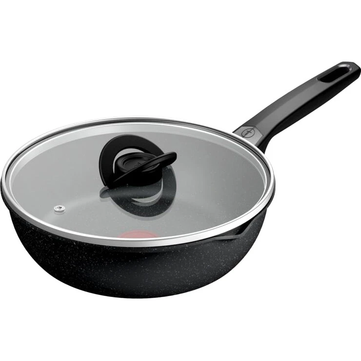 Ручка из бакелита обеспечивает надежный и удобный захват, при этом оставаясь холодной во время готовки. Стеклянная крышка позволяет контролировать процесс приготовления, не открывая сковороду, что сохраняет тепло и аромат блюд. Это делает процесс приготовления не только удобным, но и более эффективным.