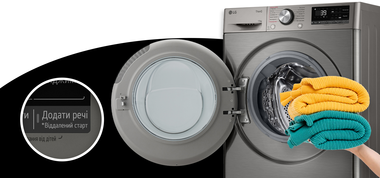 С LG вам больше не придется стирать снова и снова – просто добавляйте забытые вещи и стирайте с общей загрузкой. Достаточно нажать кнопку «Добавить вещи», чтобы загрузить небольшие носки и футболки или крупную куртку, даже после старта программы. Легко раскрывайте дверцу* и добавляйте все, что забыли вместо того, чтобы откладывать на новую стирку – легко и без перенастройки программ.