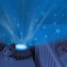 звуковой модуль: колыбельная, лаундж, звуки природы; датчик плача; 4 цвета: оранжевый, голубой, зеленый, мультиколор; регулирование громкости; можно стирать, сняв световой модуль; размеры: 24 х 14 х 12 см; батарейки 3 x AA, нет в комплекте