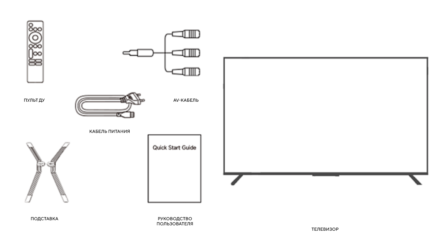 телевизор; подставка; пульт ДУ; AV-кабель; кабель питания; инструкция; гарантийный талон