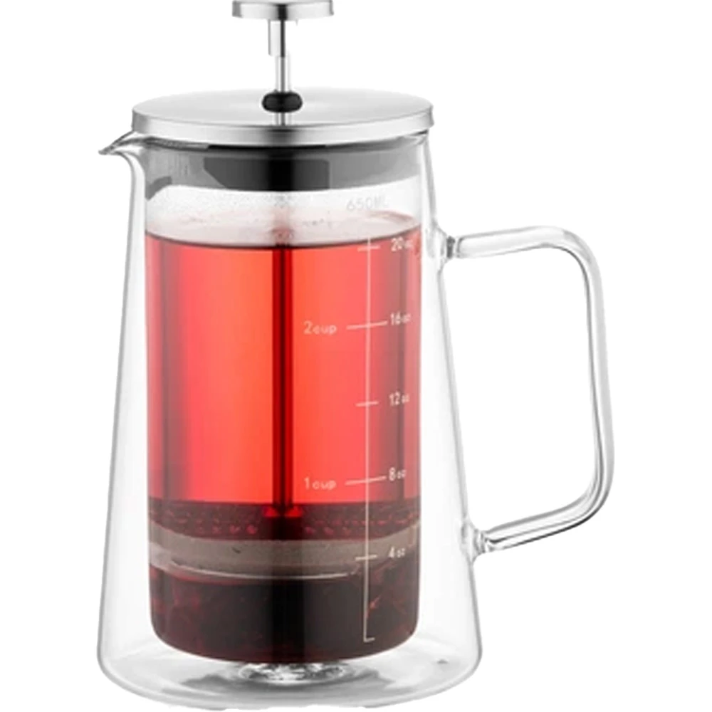 Ёмкость френч-пресса составляет 0.65 литра, что позволяет приготовить достаточное количество напитка для нескольких человек. Это делает его отличным выбором как для личного использования, так и для небольших компаний. Прозрачный корпус из термостойкого стекла не только устойчив к высоким температурам, но и позволяет наблюдать за процессом заваривания, что добавляет эстетической привлекательности и удовольствия от использования.