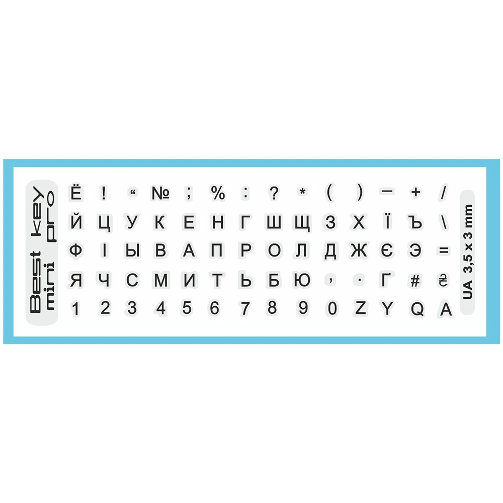 Основною перевагою цих наклейок є їхній розмір. З розмірами букв 3.5 х 3 мм, вони забезпечують чіткість та легкість читання, що особливо важливо для тих, хто проводить багато часу за комп'ютером. Вони ідеально підходять для використання як вдома, так і в офісі, надаючи вашій клавіатурі унікального вигляду.