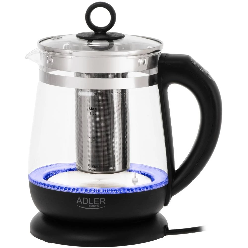 Для зручності користування ADLER AD 1299 має звуковий сигнал, який сповіщає про завершення кип'ятіння. Підсвітка додає естетичного вигляду та допомагає контролювати процес кипіння. Додаткова функція заварювання чаю робить цей електрочайник багатофункціональним кухонним помічником.