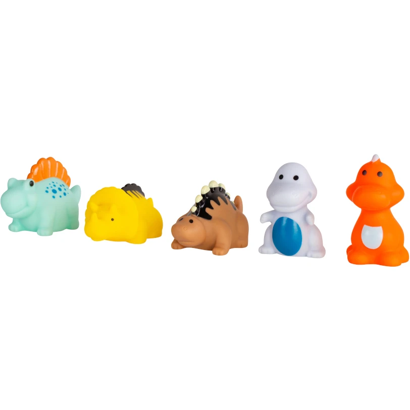 Комплектація набору включає 5 різнокольорових динозаврів, які легко утримуються в маленьких ручках, що сприяє розвитку дрібної моторики. Вони можуть бути використані як для ігор у ванній, так і для розваг на суші, додаючи різноманітності у процес гри.