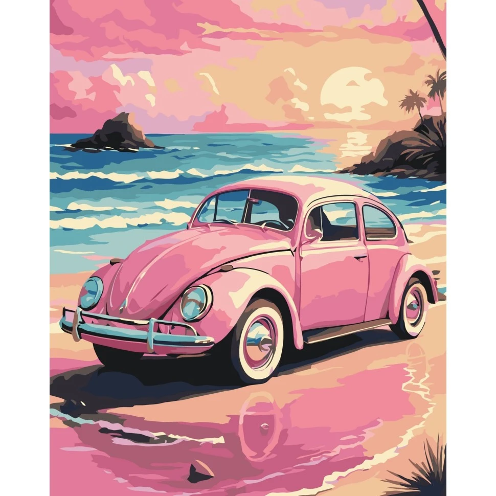Цей набір включає все необхідне для створення картини: полотно з бавовни розміром 40 х 50 см, яке натягнуте на дерев'яний підрамник, набір фарб з 19 кольорів, пензлі та лак для завершення роботи. Сюжет картини – автомобілі, зокрема, яскравий рожевий жук, що стане чудовим доповненням до інтер'єру або оригінальним подарунком для близької людини.