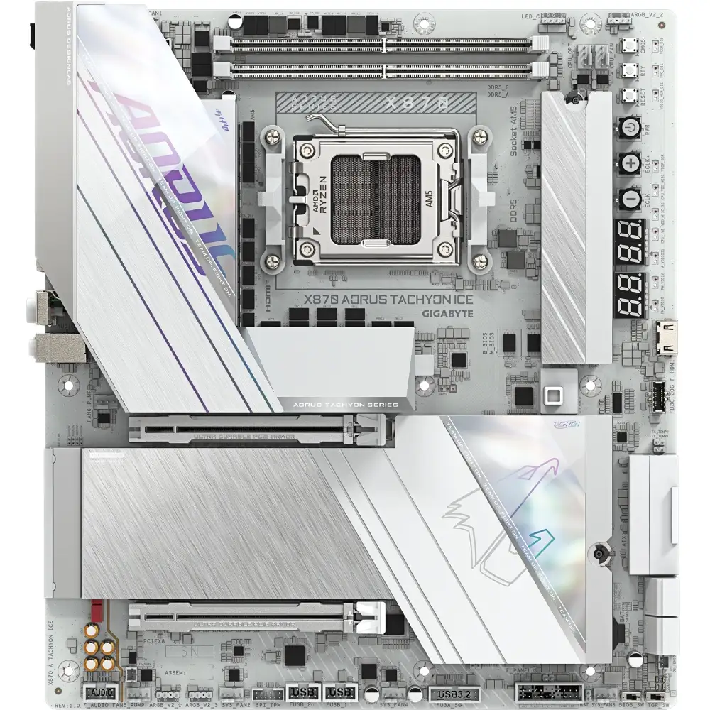Оснащена сокетом AMD AM5, ця материнська плата підтримує процесори серії AMD Ryzen 7000, 8000 та 9000, що забезпечує надзвичайну потужність і швидкість обробки даних. Завдяки чіпсету AMD X870, GIGABYTE X870 AORUS TACHYON ICE гарантує стабільну роботу навіть під час найінтенсивніших навантажень.