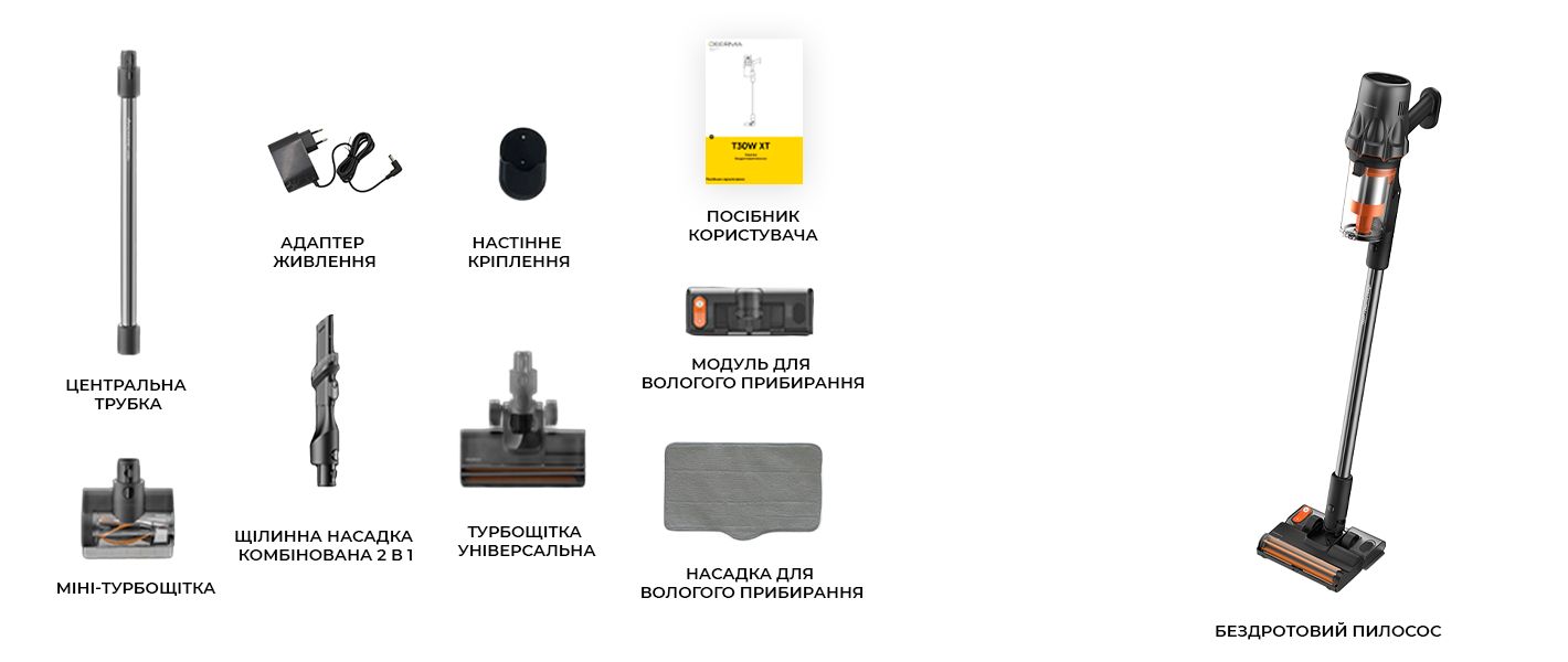 У коробці з DEERMA T30W XT ви зможете знайти всі необхідні аксесуари, які