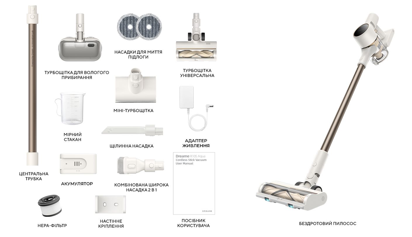 DREAME R10s Aqua поставляється з великою кількістю корисних аксесуарів – у