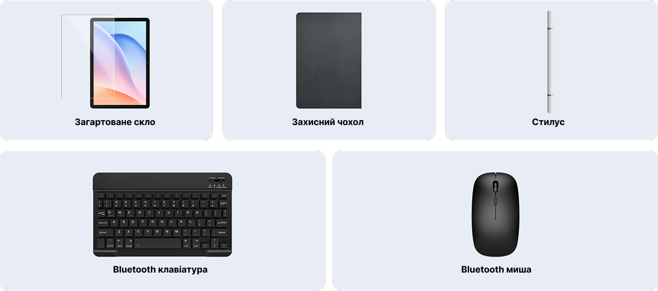планшет, клавіатура, стілус, чохол, захисне скло, зарядний пристрій, кабель