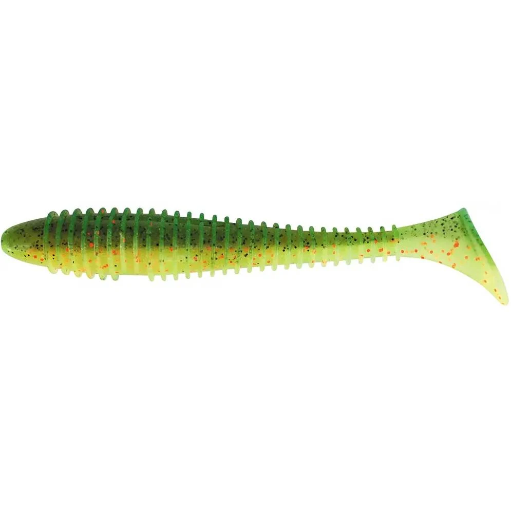 Тип приманки - віброхвіст, що дозволяє створювати природні коливання у воді, імітуючи рухи живої рибки. Довжина приманки становить 97 мм, що є оптимальним для залучення різноманітних видів хижої риби. Колір "Hot Fire Tiger" - зелений з яскравими акцентами, що забезпечує видимість приманки у різних умовах освітлення та прозорості води.