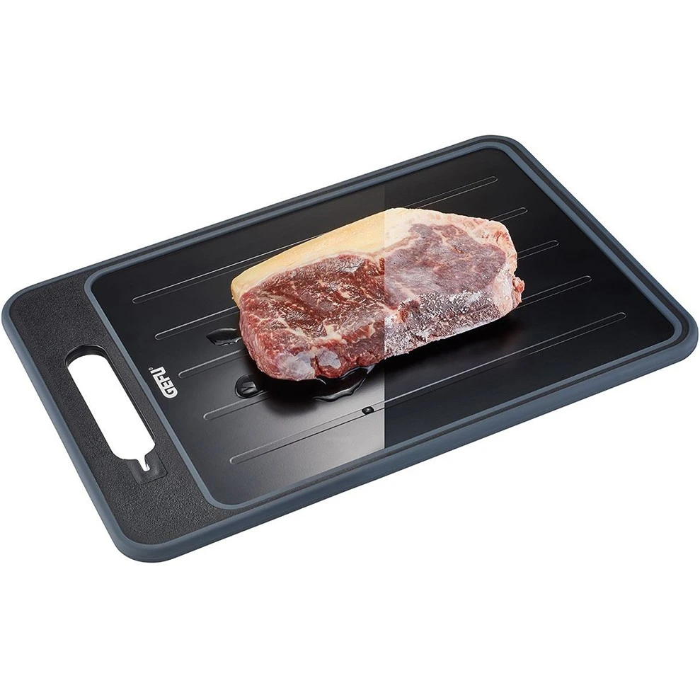 алюмінієва сторона для розморожування; пластикова - для нарізки; вбудована міні-терка; рукоятка з точилкою; протиковзна окантовка; сторона для розморожування не призначена для нарізки