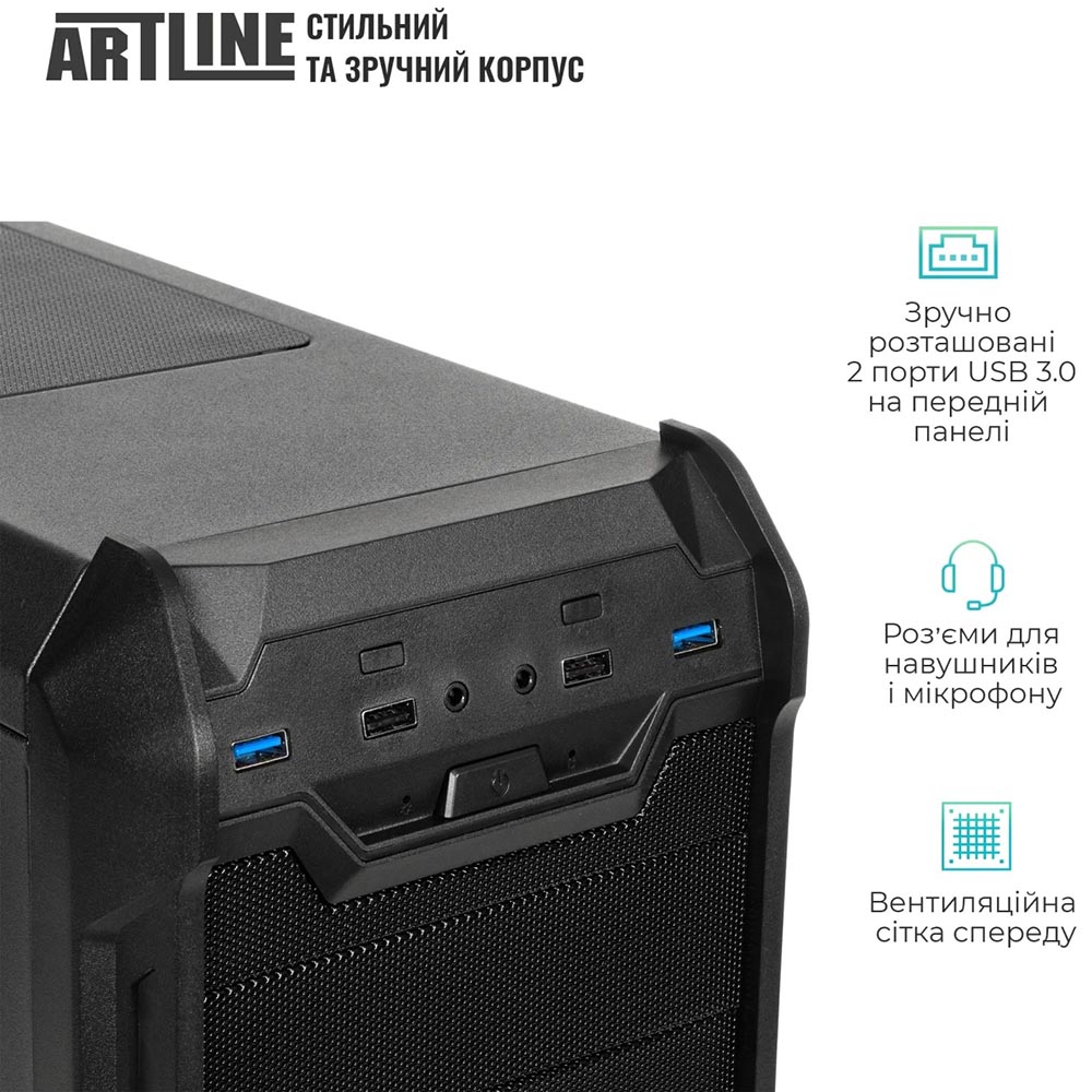 Комп'ютер ARTLINE WorkStation W73 постачається з операційною системою Windows 11 Pro, що надає користувачам доступ до широкого спектру функцій та підвищеної безпеки. Модель корпуса QUBE SUCCESSOR забезпечує не тільки стильний зовнішній вигляд, але й ефективну вентиляцію для збереження оптимальної температури компонентів.