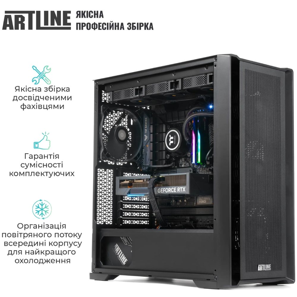 материнська плата: TUF GAMING X870-PLUS WIFI; охолодження процесора: Premium 360mm WaterCooler WS; охолодження корпусу: 3x140mm Black fans (Front) + 1x140mm Black fan (Rear) + 3x120mm Black fans (Top for cooling system)
