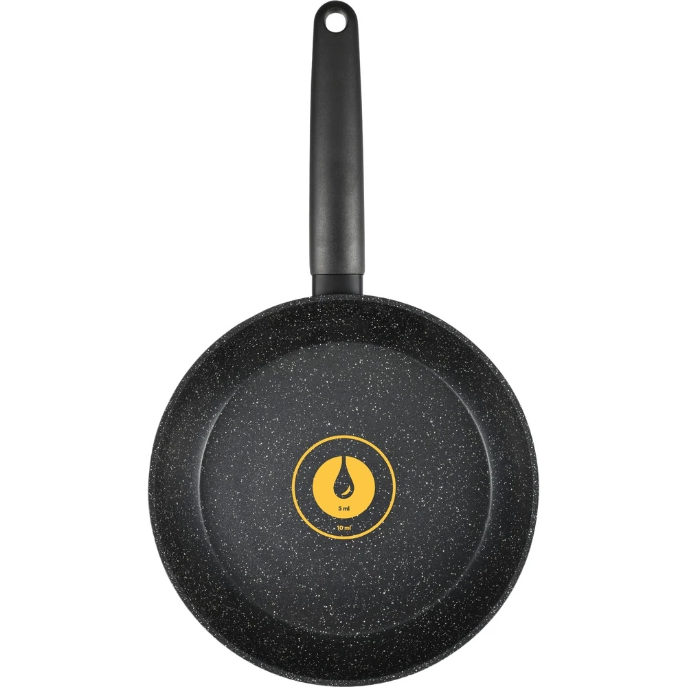 Ручка виготовлена з бакеліту та має покриття Soft Touch, що забезпечує комфортний та безпечний захват. Це особливо важливо під час приготування на високих температурах, оскільки ручка не нагрівається і не ковзає в руці. Товщина стінки сковороди становить 2,5 мм, що гарантує рівномірне нагрівання та довговічність використання.