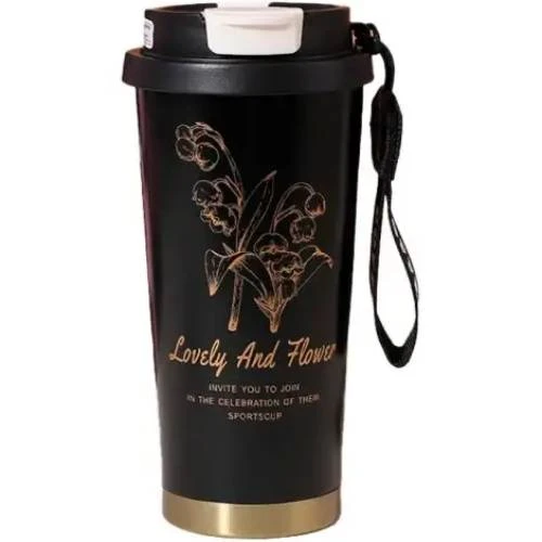Особливий акцент варто зробити на стилістичному оформленні термокухля. Чорний колір корпусу в поєднанні із золотистими елементами додає виробу елегантності та сучасності. Такий дизайн буде доречним як в офісі, так і на прогулянці, підкреслюючи індивідуальність власника та його відчуття стилю.