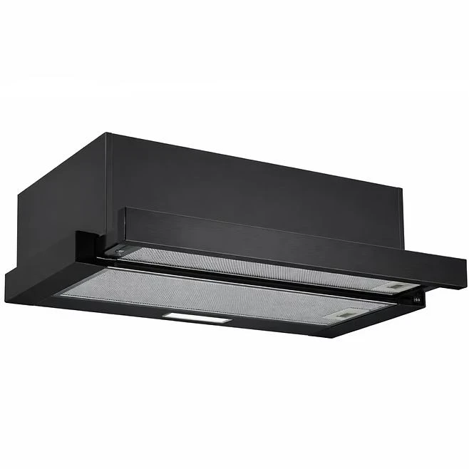 Витяжка виконана у класичному чорному кольорі з декоративними елементами зі скла, що додає елегантності та сучасності вашій кухні. Ширина витяжки становить 60 см, а висота — 17.6 см, що дозволяє легко інтегрувати її в будь-який кухонний простір.