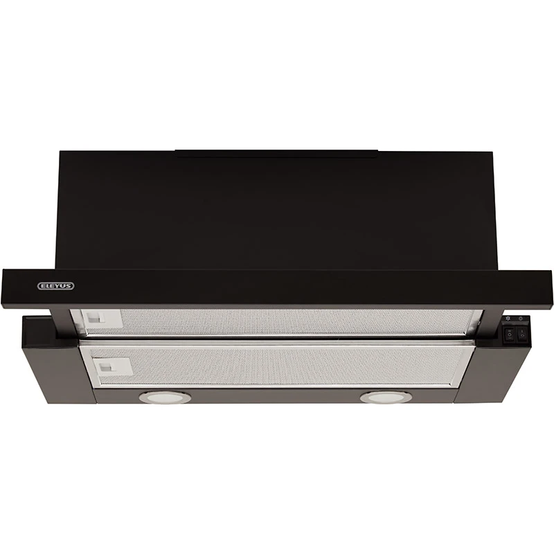 Витяжка оснащена алюмінієвим жировим фільтром, що ефективно затримує жир та пил. Керування здійснюється за допомогою кнопкових та кулісних перемикачів, що робить управління простим та інтуїтивно зрозумілим. Чорний корпус витяжки додає стильності та підкреслює сучасний дизайн кухні.